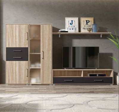 Aparador de 3 cajones de madera + 1 trampon de cristal transparente abatible + 1 puerta de madera + 1 puerta de madera-cristal.